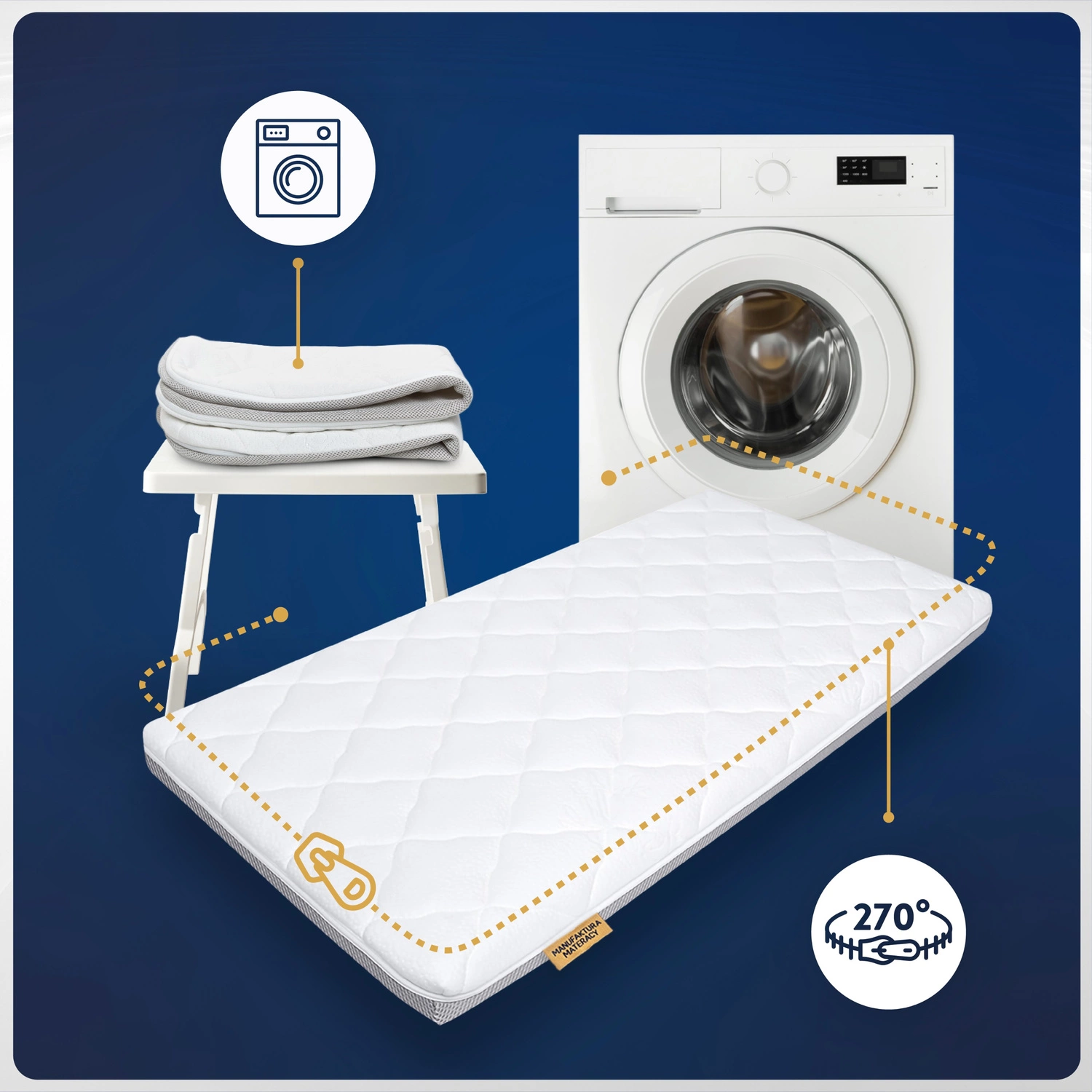 1. System wentylacji w materacu Lepsza higiena snu i wyjątkowy komfort cieplny Twojego maluszka dzięki połączeniu poziomych kanałów wentylacyjnych i siatki oddychającej w pokrowcu. 2. Dwustronność pokrowca Dostosuj stronę pokrowca w zależności od aktualnej pory roku – oddychająca strona sprawdzi się latem, cieplejsza strona zimą. 3. Możliwość prania pokrowca Możliwość wielokrotnego prania w temperaturze do 40°C, co pozwala zadbać o higienę i świeżość przy codziennym użytkowaniu.