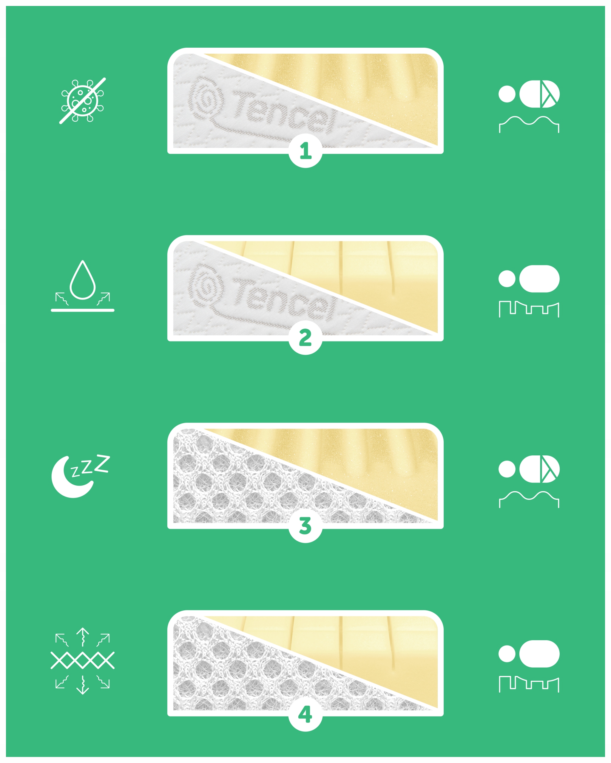 Strona wkładu: START (H3) + strona pokrowca TENCEL™. Gwarantuje twarde, stabilne podparcie i antybakteryjny komfort dla wrażliwej skóry.