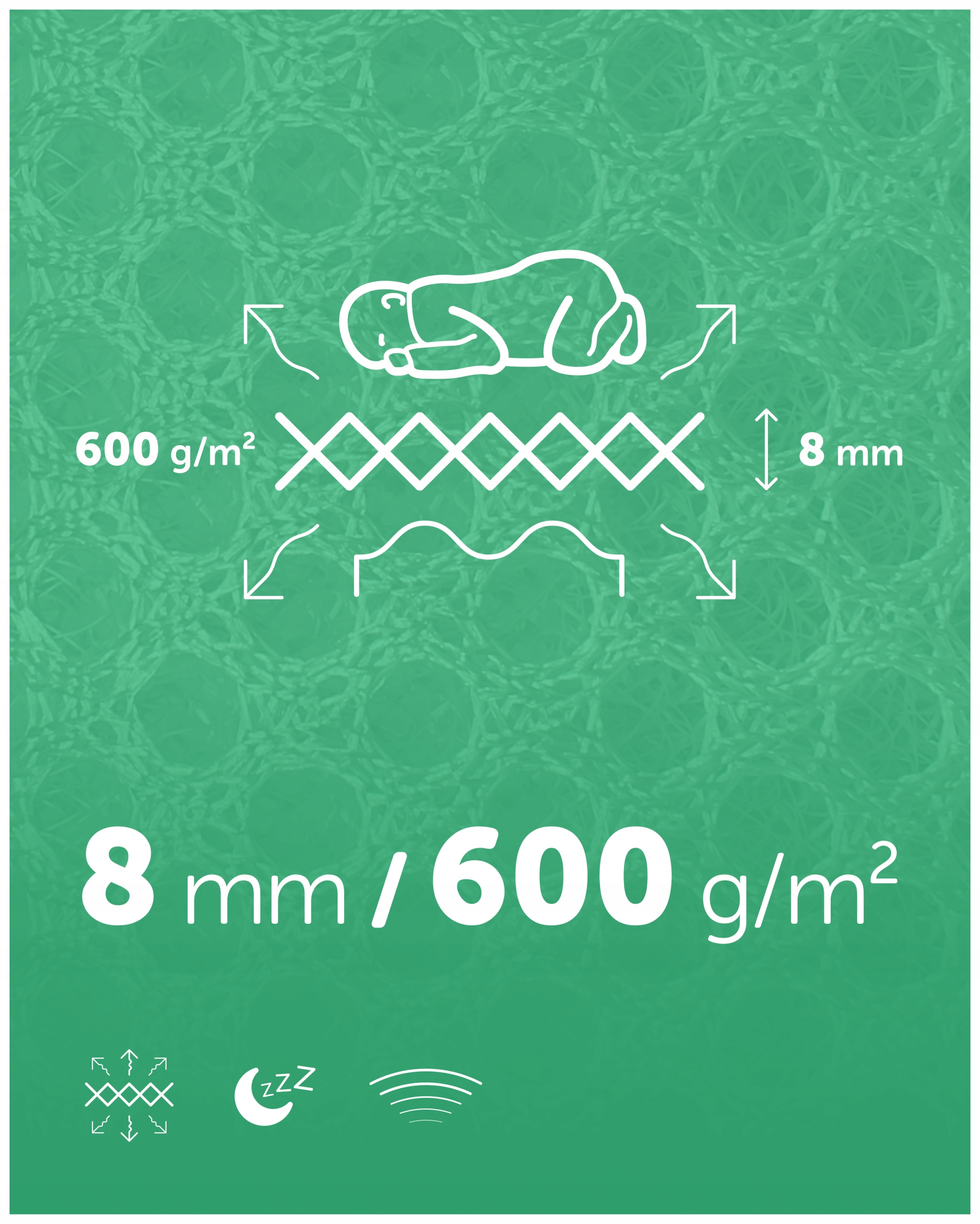 W pokrowcu materaca Fizjomax™ Baby zastosowaliśmy dystansową siatkę 3D o grubości aż 8 mm i gramaturze 600 g/m2. Taka konstrukcja wytrzyma rosnącą wagę dziecka. Spłaszczanie się jej pod coraz większym naciskiem będzie znacznie wolniejsze.