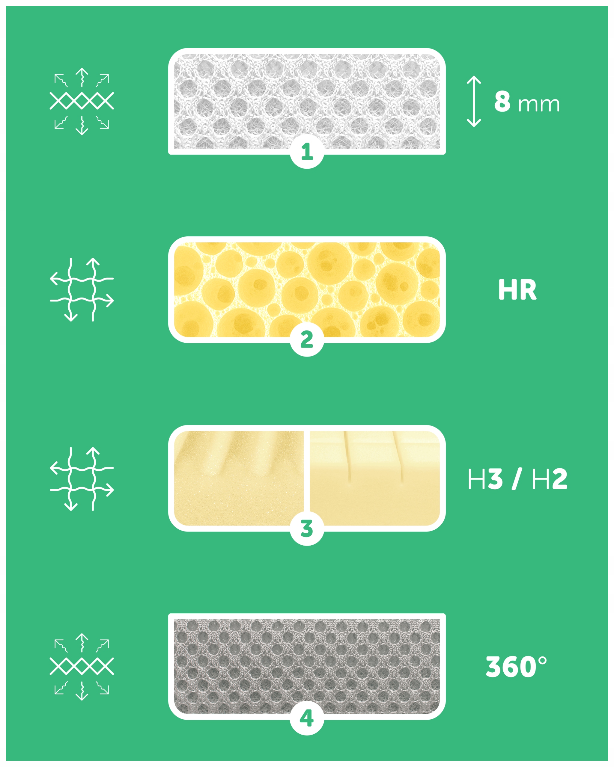 • Strona z pianki HR 40 kg/m³ – sprężysta i przewiewna
