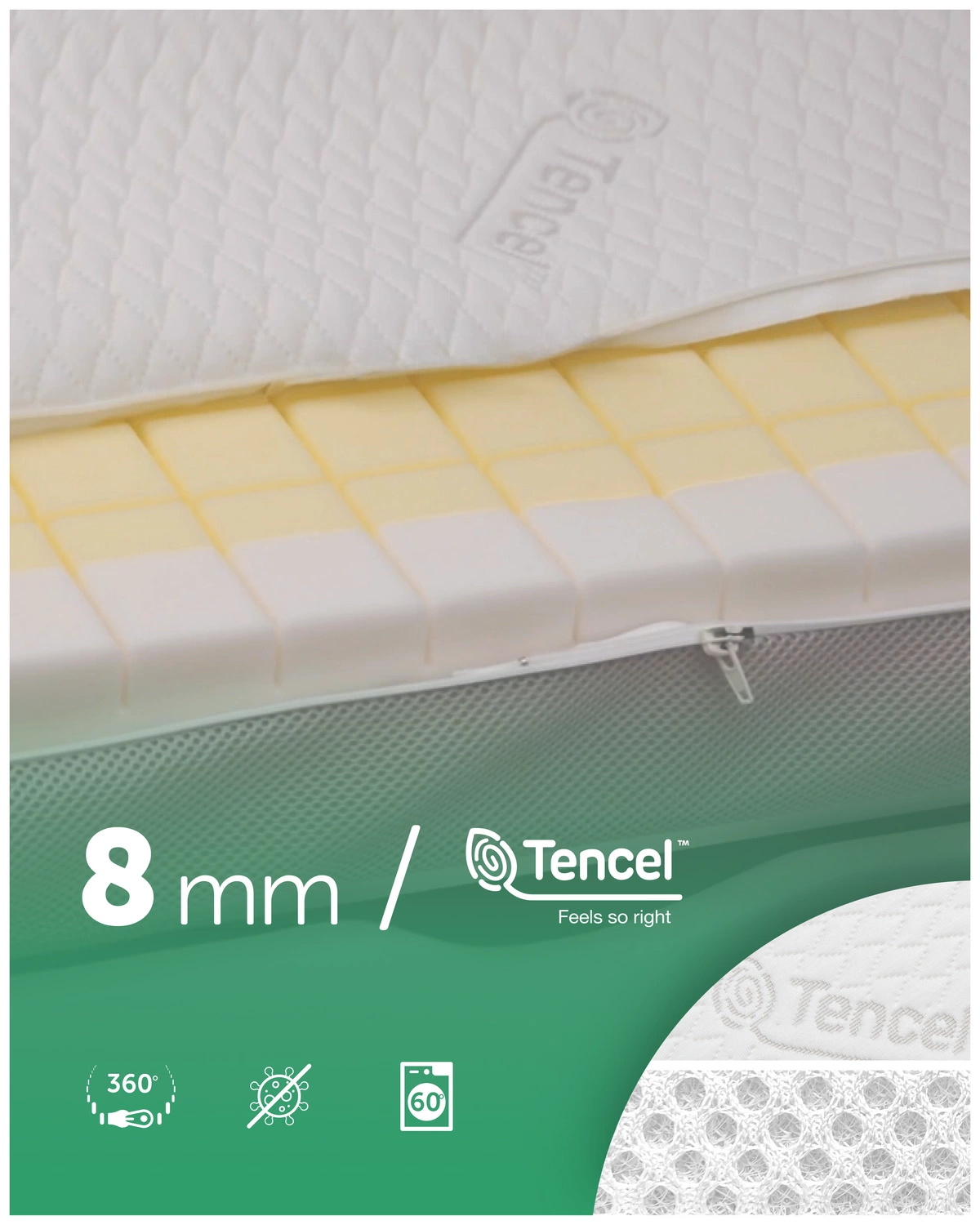 Czy mogę położyć materac bezpośrednio na podłodze?Nie rekomendujemy takiego rozwiązania – brak wentylacji od spodu może prowadzić do gromadzenia się wilgoci, a w konsekwencji do rozwoju pleśni i pogorszenia higieny snu. Jeśli jednak z jakiegoś powodu musisz położyć materac na podłodze, pamiętaj o kilku zasadach: – Regularnie podnoś materac, aby umożliwić jego przewietrzenie. – Obserwuj, czy nie pojawia się wilgoć pod spodem lub w pokrowcu. – Częściej pierz pokrowiec, aby zachować świeżość i czystość. – Materac połóż stroną z siateczką wentylacyjną do podłogi – poprawi to cyrkulację powietrza. – Dla dodatkowej ochrony oddychalności warto rozważyć zakup ochraniacza z siateczką 3D. Takie użytkowanie wymaga większej troski, ale przy zachowaniu ostrożności może być możliwe bez ryzyka dla dziecka.