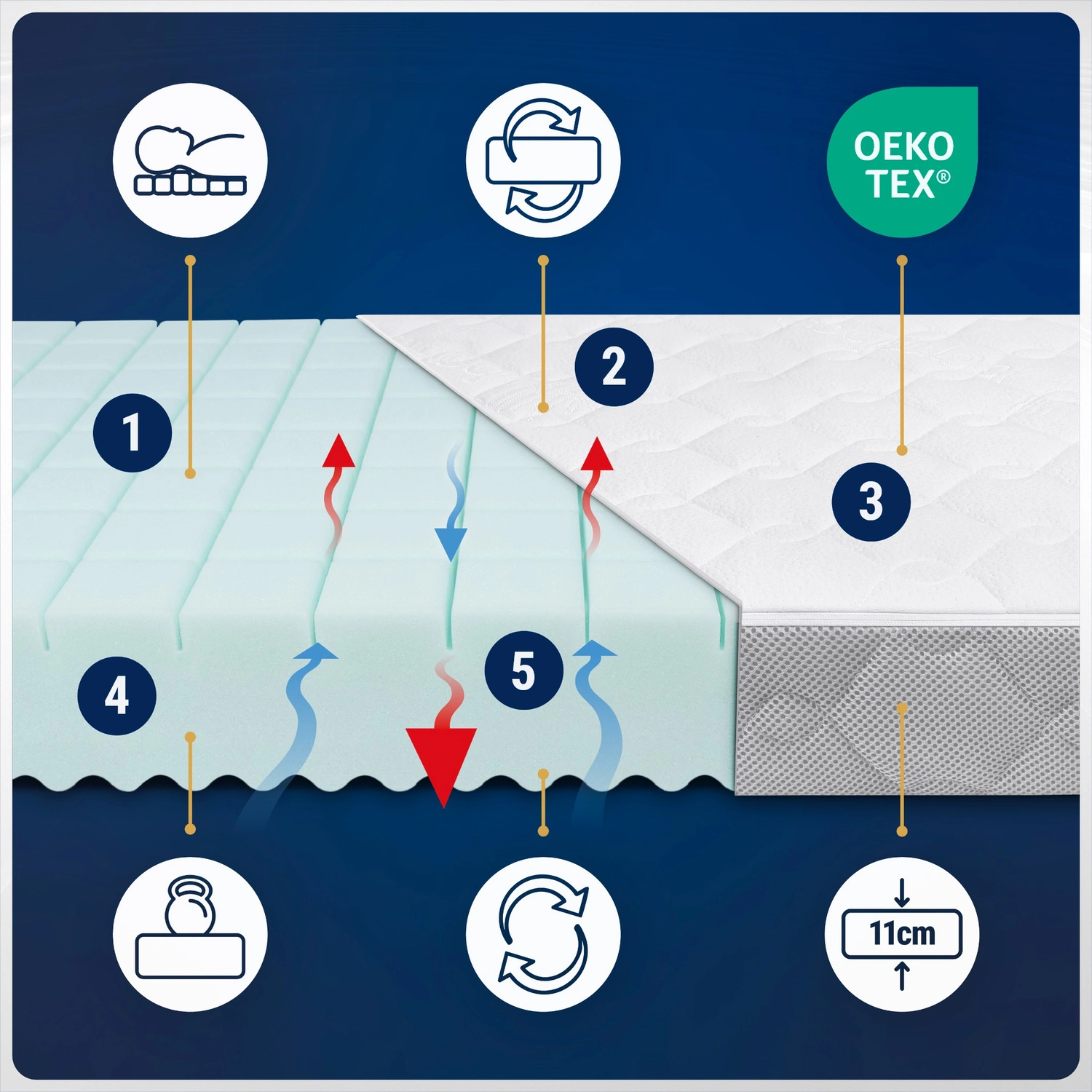 4️⃣ Trwałe wsparcie: Grubość 11 cm i gęstość pianki T 35 kg/m3 gwarantują brak deformacji płaszczyzny snu.