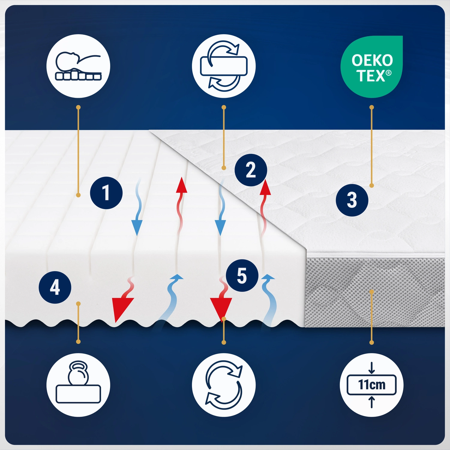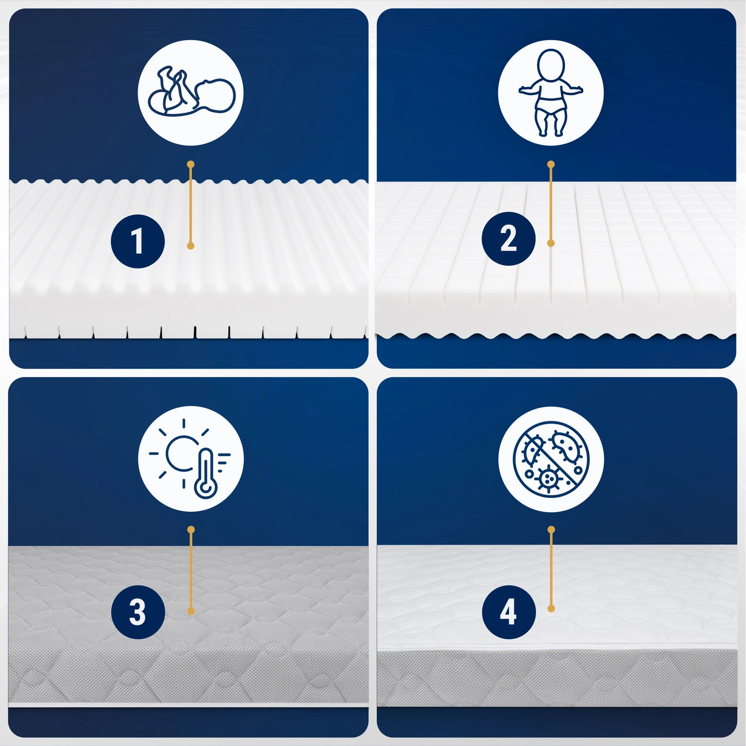 Co rodzice najmocniej cenią w tym produkcie?1. System wentylacji w materacu Lepsza higiena snu i wyjątkowy komfort cieplny Twojego maluszka, dzięki połączeniu poziomych kanałów wentylacyjnych, siatki oddychającej 8 mm na powierzchni do spania oraz siateczki wentylacyjnej umieszczonej po boku materaca. 2. Profile wkładu piankowego Panele piankowe – twardość H2 (strona średnio-twarda), rekomendowana po 12. miesiącu życia i dla dzieci z tendencją do przegrzewania. Delikatna fala – twardość H3 (strona twarda), idealna do 12. miesiąca lub gdy zależy Ci na stabilnym, twardym podłożu. 3. Możliwość prania pokrowca Możliwość wielokrotnego prania w temperaturze do 40°C – pozwala utrzymać świeżość i higienę nawet przy intensywnym użytkowaniu.
