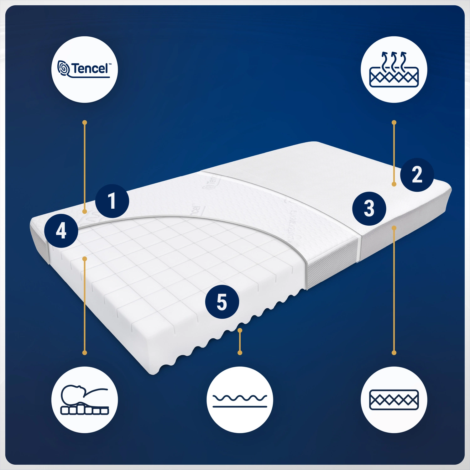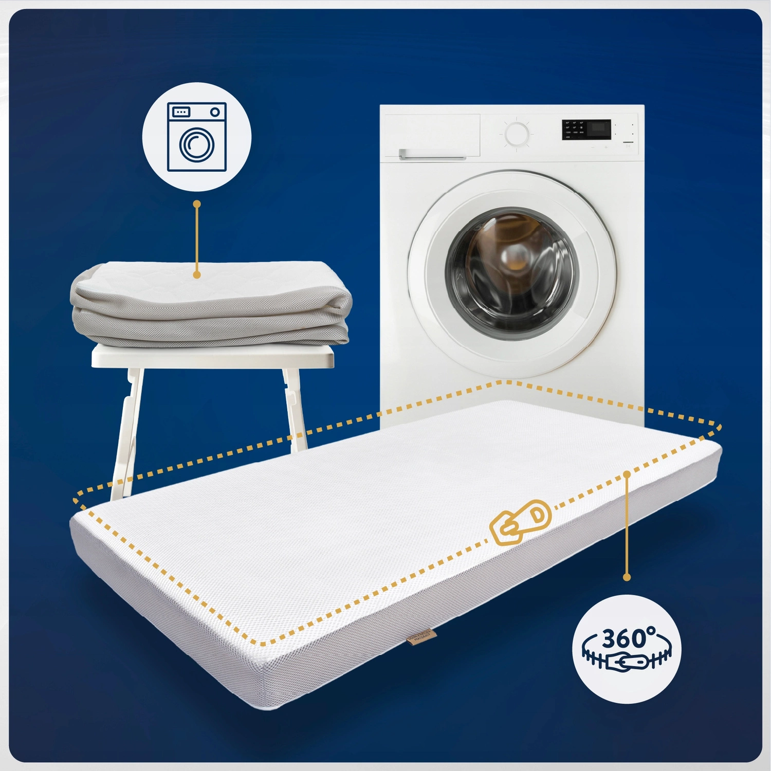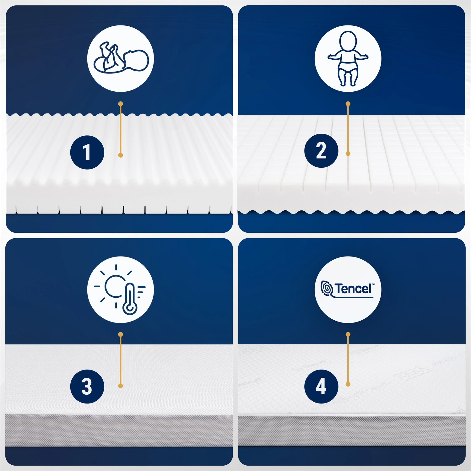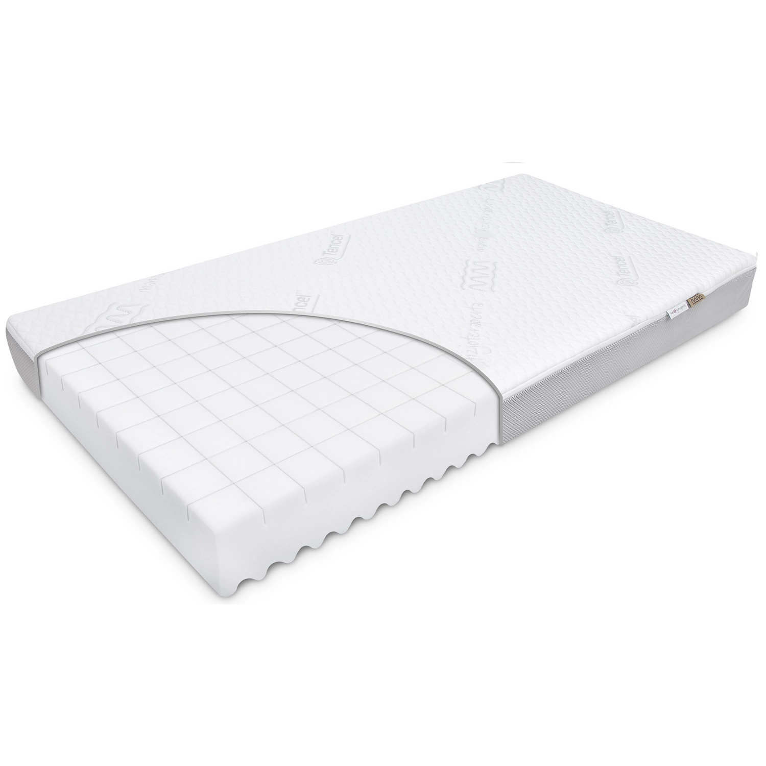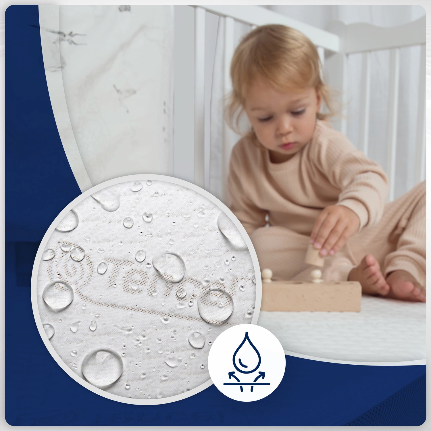 Co rodzice najmocniej cenią w tym produkcie?1. Oddychająca ochrona przed przemoczeniem Włókno Tencel pozyskiwane z celulozy drzewnej – naturalnie antybakteryjne i przyjazne dla wrażliwej skóry dziecka. 2. Profile wkładu piankowego Panele piankowe – twardość H2 (strona średnio-twarda), rekomendowana po 12. miesiącu życia i dla dzieci z tendencją do przegrzewania. Delikatna fala – twardość H3 (strona twarda), idealna do 12. miesiąca lub gdy zależy Ci na stabilnym, twardym podłożu. 3. Możliwość prania pokrowca Możliwość wielokrotnego prania w temperaturze do 60°C – pozwala utrzymać świeżość i higienę nawet przy intensywnym użytkowaniu.