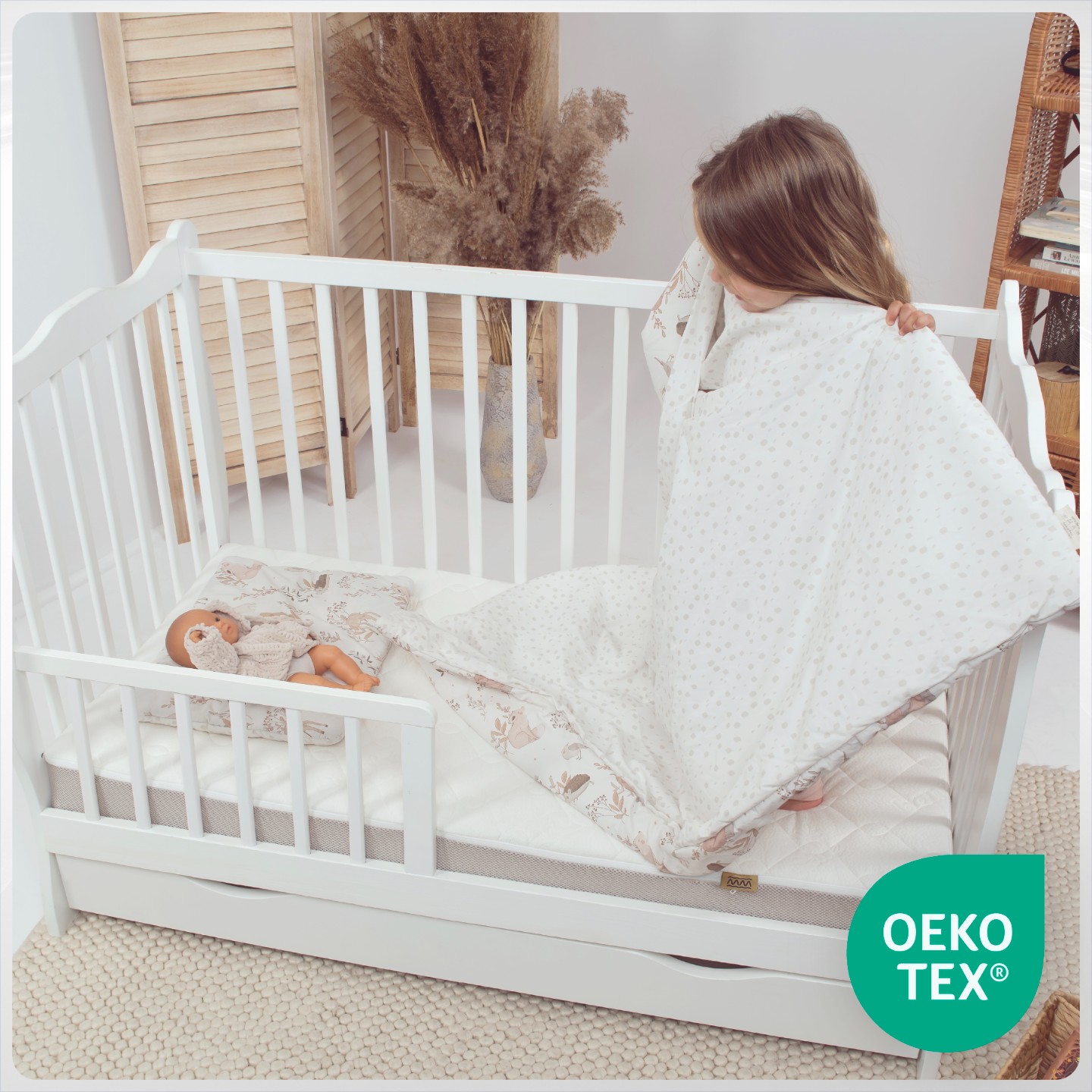 Produkty wykonujemy wyłącznie z materiałów bezpiecznych dla dzieci, dobranych z myślą o ich zdrowiu i komforcie. Ten produkt posiada Pozytywną Opinię Instytutu Matki i Dziecka oraz certyfikat OEKO-TEX® Standard 100 w klasie I, co oznacza, że jest odpowiedni już od pierwszych dni życia. Zastosowane materiały zostały także przetestowane przez Instytut Łukasiewicza w Łodzi pod kątem trwałości i bezpieczeństwa użytkowania. Tak, materiały te są hipoalergiczne i zaprojektowane tak, aby minimalizować ryzyko alergii u dzieci.