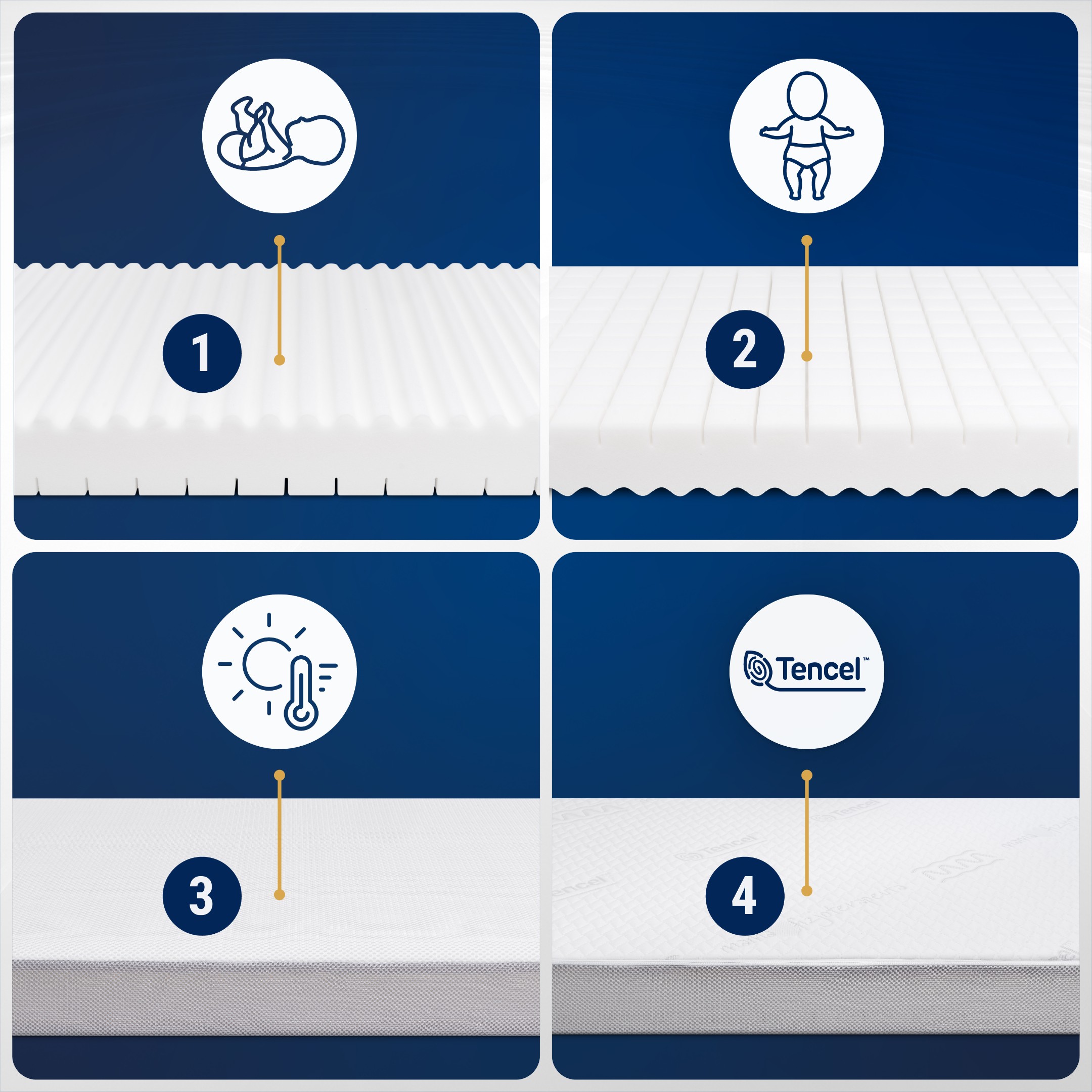 1. Oddychająca ochrona przed przemoczeniem Włókno Tencel pozyskiwane z celulozy drzewnej – naturalnie antybakteryjne i przyjazne dla wrażliwej skóry dziecka. 2. Profile wkładu piankowego Panele piankowe – twardość H2 (strona średnio-twarda), rekomendowana po 12. miesiącu życia i dla dzieci z tendencją do przegrzewania. Delikatna fala – twardość H3 (strona twarda), idealna do 12. miesiąca lub gdy zależy Ci na stabilnym, twardym podłożu. 3. Możliwość prania pokrowca Możliwość wielokrotnego prania w temperaturze do 60°C – pozwala utrzymać świeżość i higienę nawet przy intensywnym użytkowaniu.