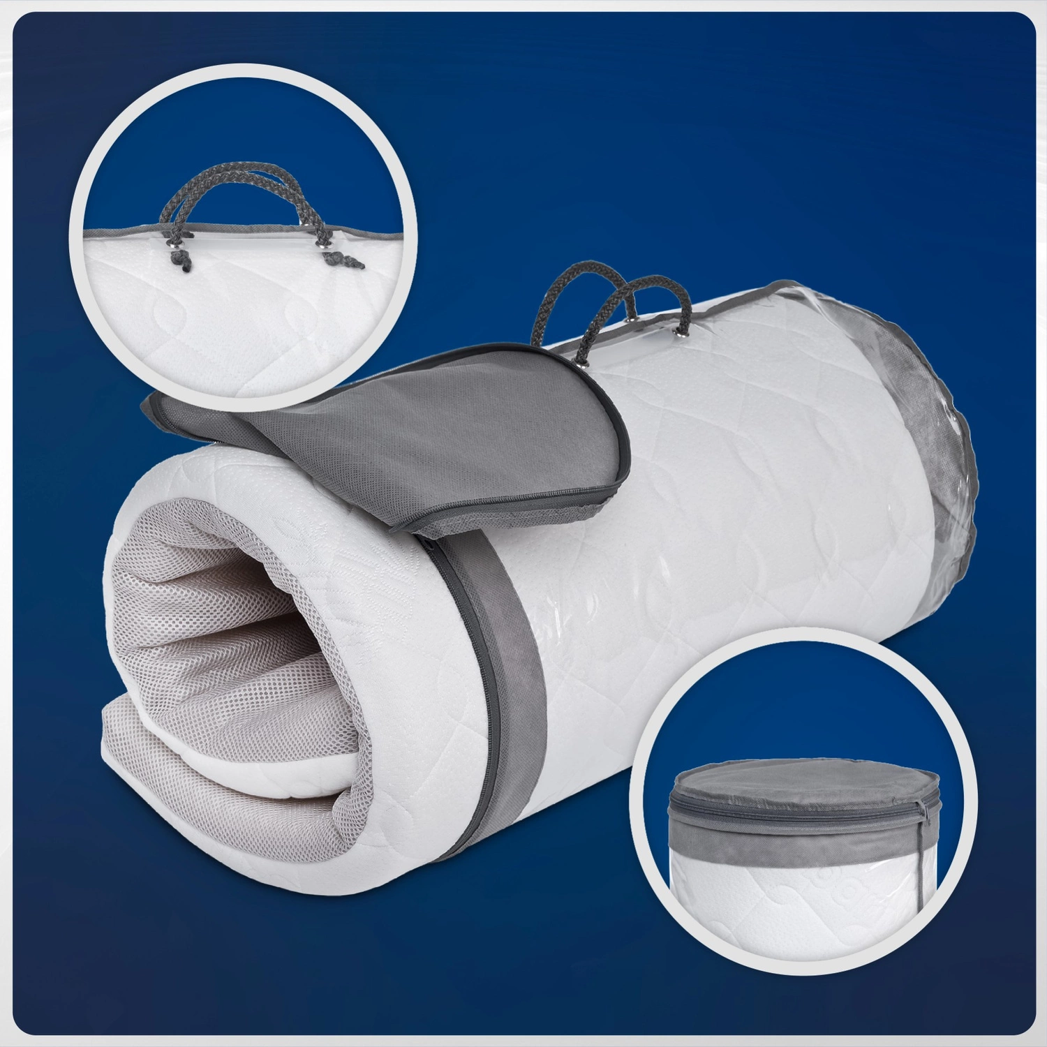 ✅ Wygodne przenoszenie – torba ułatwiająca transport Dzięki profilowanej piance materac łatwo się roluje i bez problemu mieści w torbie. Mocna tuba z wzmocnioną rączką i trwałymi szwami zapewnia wygodę noszenia i trwałość, nawet przy częstych podróżach. Ochrona przed zabrudzeniami sprawia, że materac pozostaje czysty i gotowy do użycia w każdych warunkach.