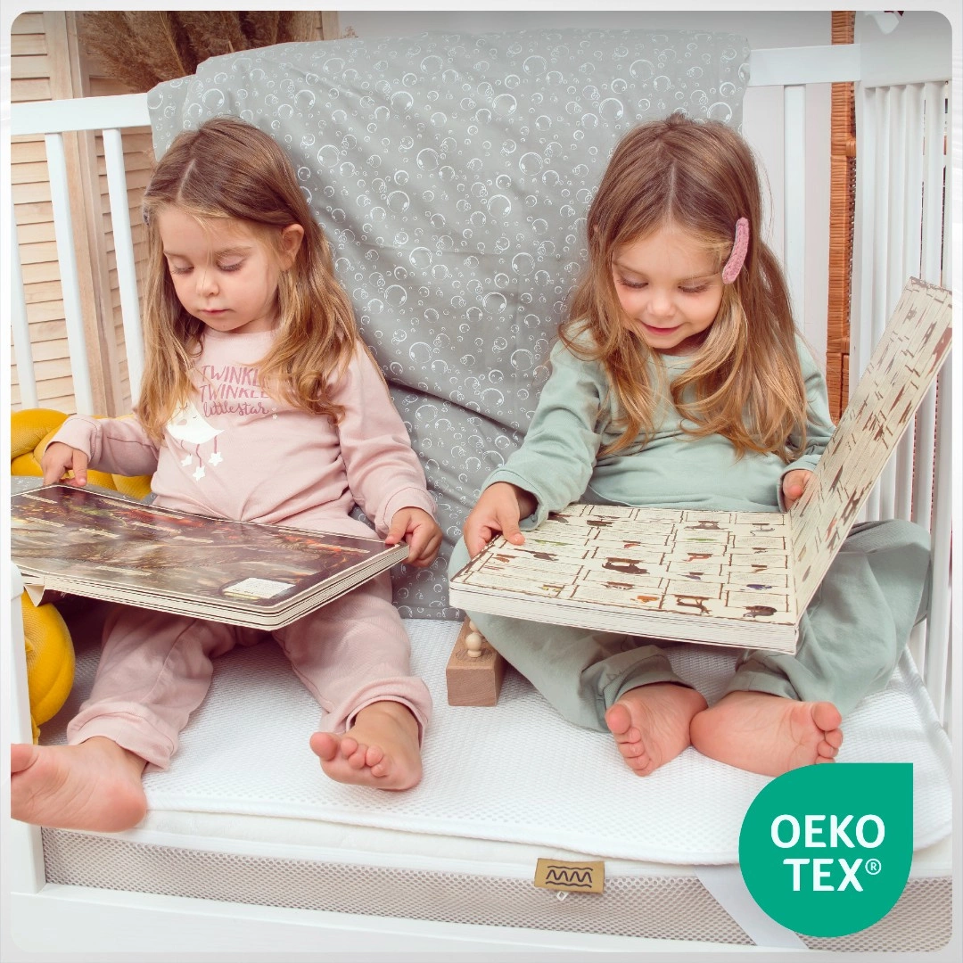 Termin „antyalergiczny oznacza, że produkt nie zawiera składników powszechnie uznawanych za potencjalnie uczulające – nie oznacza jednak, że nie wywoła reakcji alergicznej u żadnego dziecka. Każdy organizm jest inny i może zareagować nawet na materiały uznawane za bezpieczne. Na co warto zwrócić uwagę? Do grupy składników, które budzą największe wątpliwości w kontekście alergii, należy lateks. Pozyskiwany z mleka kauczukowca, zawiera białka mogące uczulać niektóre osoby. Również maty kokosowe są lateksowane, co oznacza, że mogą zawierać ten sam potencjalny alergen. Niektórzy producenci określają lateks jako „antyalergiczny”, powołując się na to, że nie sprzyja rozwojowi roztoczy. W rzeczywistości jednak to na odchody roztoczy alergicy reagują najczęściej, a sam lateks wciąż może być problematyczny. Co z pozostałymi materiałami? Standardowe składniki wykorzystywane w naszych produktach – takie jak pianki, dzianiny czy włókna syntetyczne – nie są uznawane za alergizujące, pod warunkiem że spełniają określone normy jakości i bezpieczeństwa. Jak potwierdzamy bezpieczeństwo? Wszystkie nasze produkty są stworzone z komponentów z certyfikatem Oeko-Tex Standard 100, który rygorystycznie sprawdza, czy dany wyrób nie zawiera substancji uznanych za szkodliwe – również z punktu widzenia alergików.