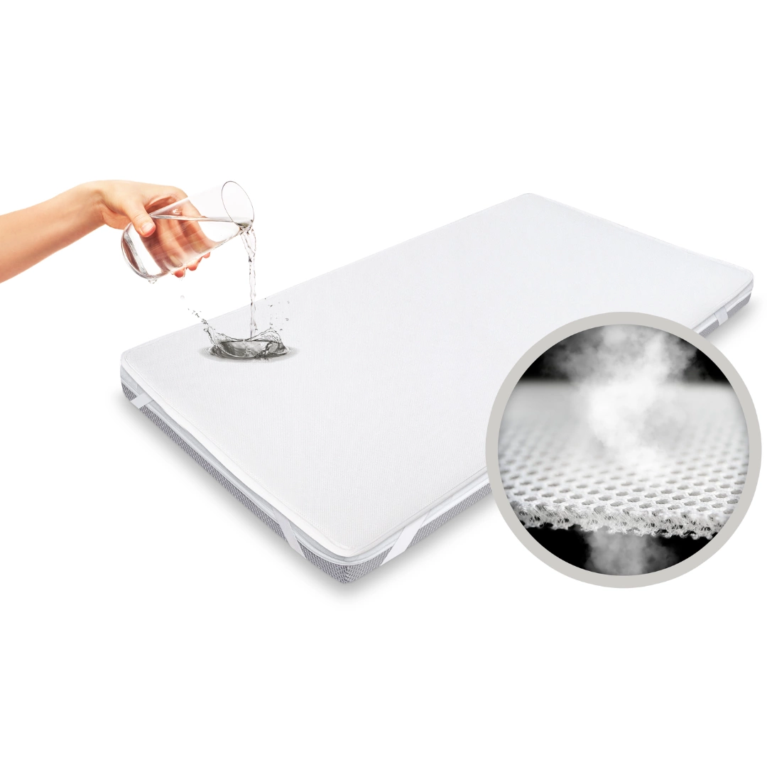 1. Oddychająca siateczka 3D Komfortowa temperatura snu, mniejsze ryzyko wybudzeń spowodowanych przegrzaniem. Lepsza higiena: mniej roztoczy, bakterii i pleśni, lepsze odprowadzanie CO₂. Efekt unoszenia się w powietrzu i izolacji dziecka od zanieczyszczeń. 2. Wodoodporny laminat 100% skuteczna ochrona materaca przed przemoczeniem i zabrudzeniem. Łatwe i szybkie zakładanie oraz zdejmowanie dzięki elastycznym materiałom. 3. Szczególnie rekomendowany W okresie odpieluchowywania – zapewnia maksymalną ochronę i higienę bez kompromisów. 4. Szerokie i mocne gumki Stabilne mocowanie, łatwość zakładania i ściągania, bez zsuwania się z materaca.