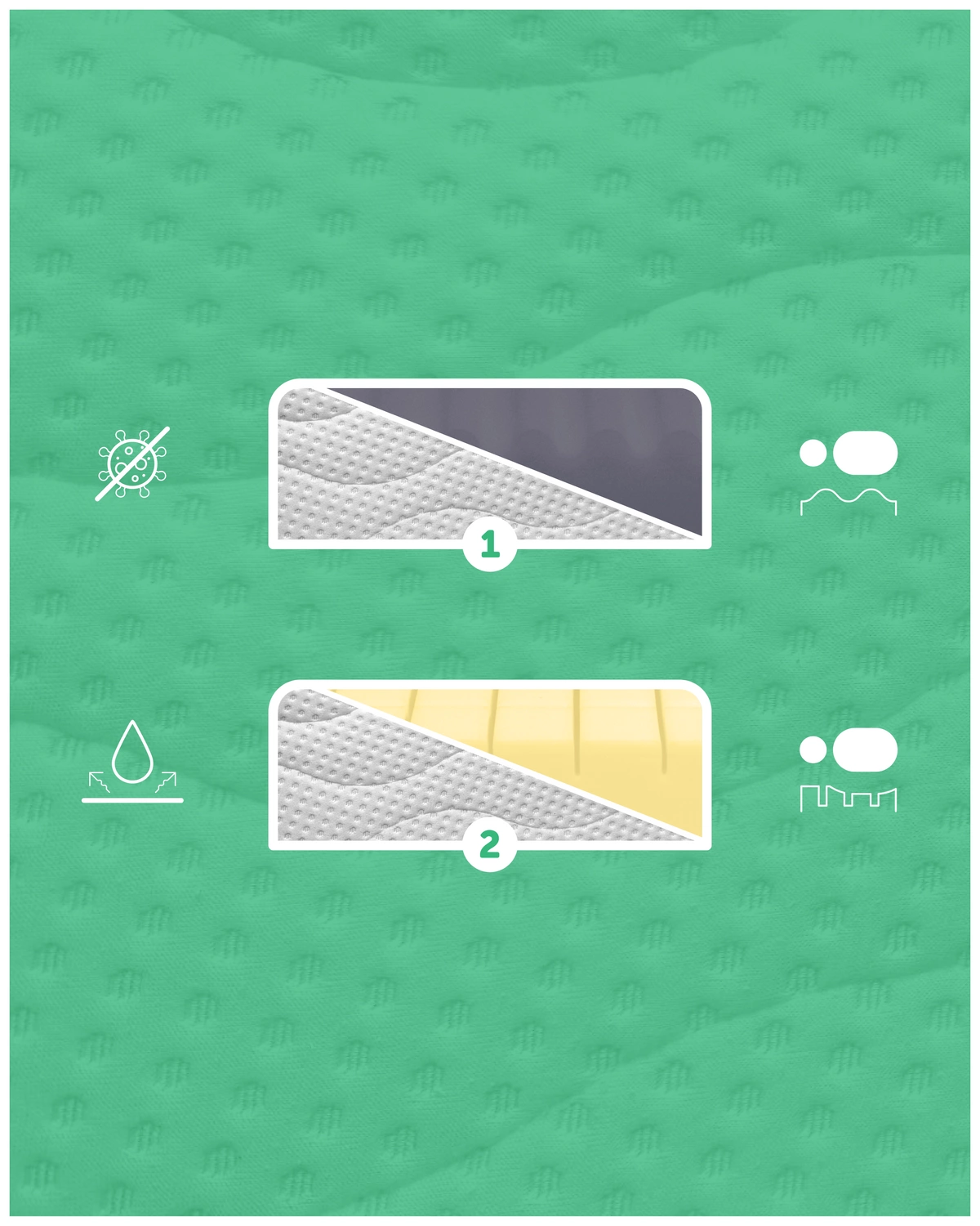 2️⃣ Profilowana powierzchnia z panelami piankowymi – fale i przetłoczenia wspierają cyrkulację powietrza, pomagając utrzymać suchy i przyjemny mikroklimat podczas snu.