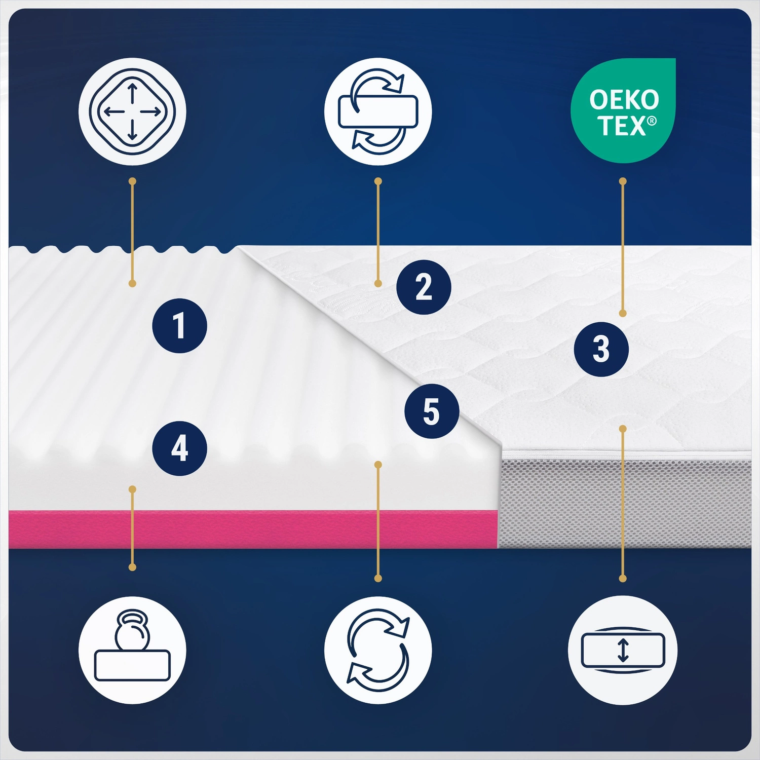 4️⃣ Trwałe wsparcie: Grubość 8 cm i gęstość wysoelastycznej pianki HR po malinowej stronie to 50 kg/m3, zapewniają stabilność i odporność na odkształcenia.