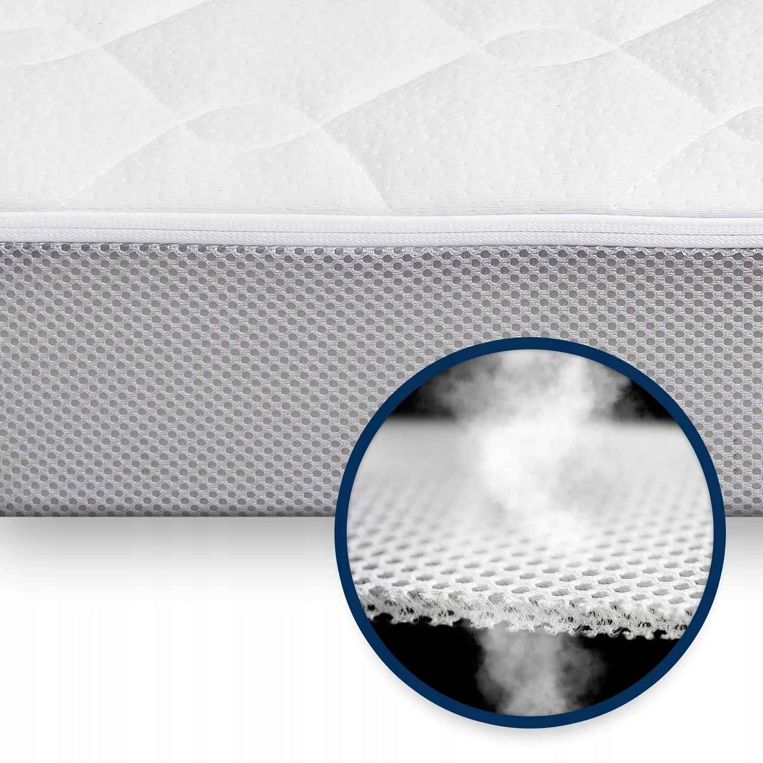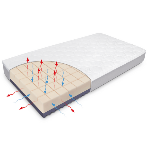 Zastosowana w materacu siatka przestrzenna 3D wspiera naturalny proces termoregulacji dziecka, umożliwiając stały przepływ powietrza wewnątrz jego struktury.