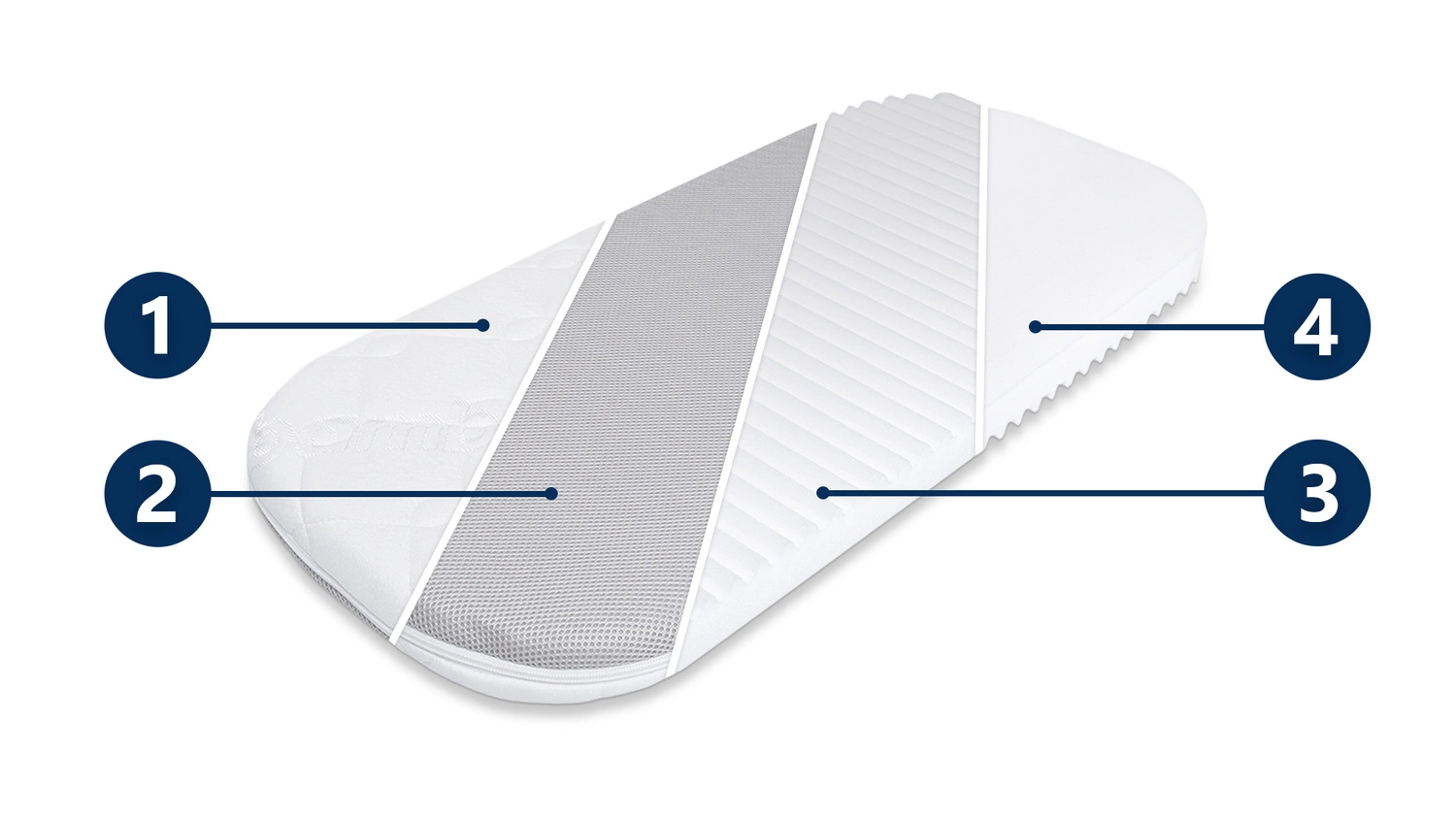 1. System wentylacji w materacu Lepsza higiena snu i wyjątkowy komfort cieplny Twojego maluszka dzięki połączeniu poziomych kanałów wentylacyjnych i siatki oddychającej w pokrowcu. 2. Dwustronność pokrowca Dostosuj stronę pokrowca w zależności od aktualnej pory roku – oddychająca strona sprawdzi się latem, cieplejsza strona zimą. 3. Możliwość prania pokrowca Możliwość wielokrotnego prania w temperaturze do 40°C, co pozwala zadbać o higienę i świeżość przy codziennym użytkowaniu.